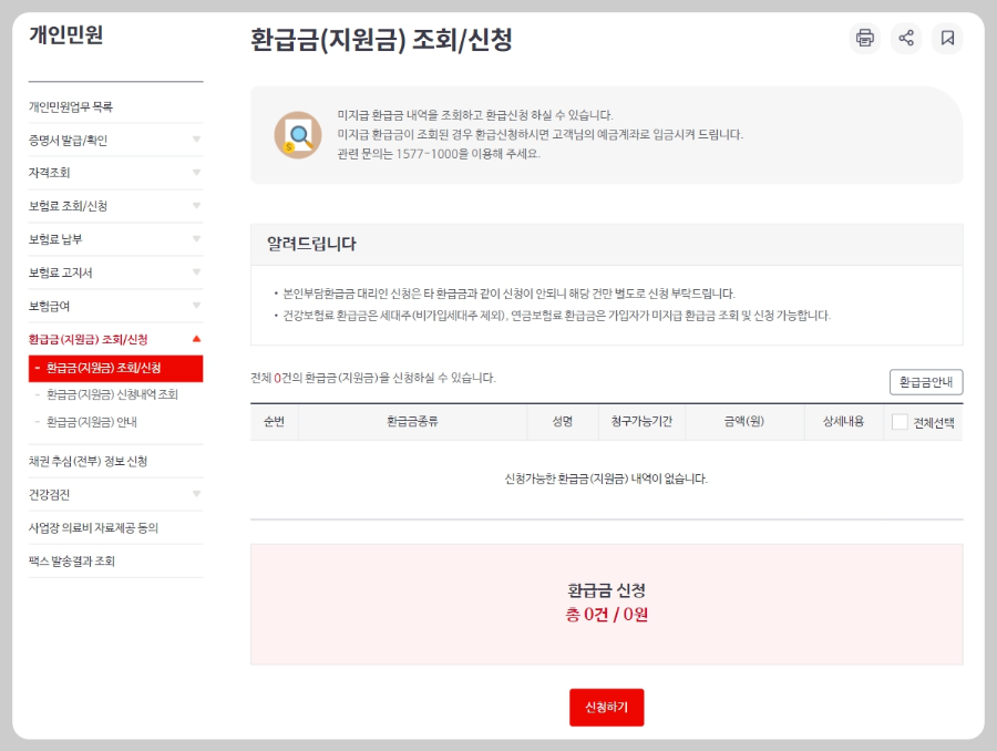 미지급 환급금이 조회된 경우에는 환급금을 신청하실 수 있습니다. 환급금 신청하시면 본인 계좌로 환급금을 받으실 수 있습니다. 지금 바로 아래의 버튼을 눌러 신청하여 환급금 받으시기 바랍니다.