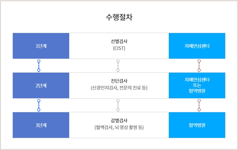 치매검사 3단계 감별검사 : 치매 확정을 받은 환자는 협약 병원을 통해 혈액검사, CT, MRI 등의 검사를 통해 치매의 원인을 확인합니다.